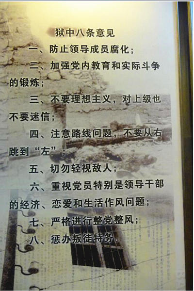 这份被提炼出的“狱中八条”包括:一、防止领导成员腐化;二、加强党内教育和实际斗争的锻炼;三、不要理想主义,对上级也不要迷信;四、注意路线问题,不要从右跳到“左”;五、切勿轻视敌人;六、重视党员特别是领导干部的经济、恋爱和生活作风问题;七、严格进行整党整风;八、惩办叛徒特务。